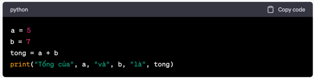 Đây là một vài ví dụ cơ bản về cú pháp Python. Python cũng có rất nhiều tính năng và chức năng khác nhau để bạn có thể tìm hiểu và sử dụng.