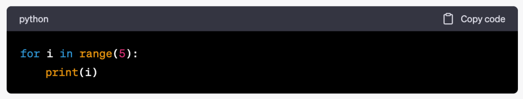 5.Sử dụng vòng lặp for để in ra các số từ 0 đến 4